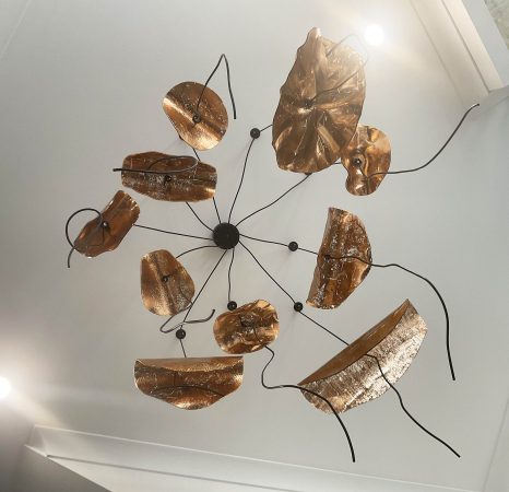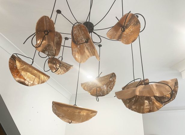 Adjustable chandelier with 10 pieces of bent glass in copper leaf