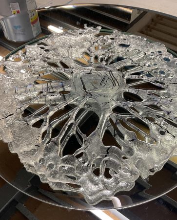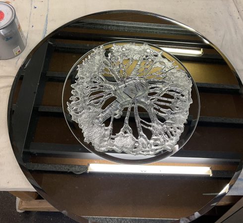 Bevelled Round mirror Bevelled Round two tiered mirror With lace coral art suspended All ready to hang. Price: $1280 SALE PRICE: $400 800 diameter