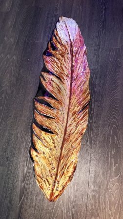 I am a glass feather series Price: $2200 SALE PRICE: $400 980 x 300mm Peacock. Silver leaf Table centre piece